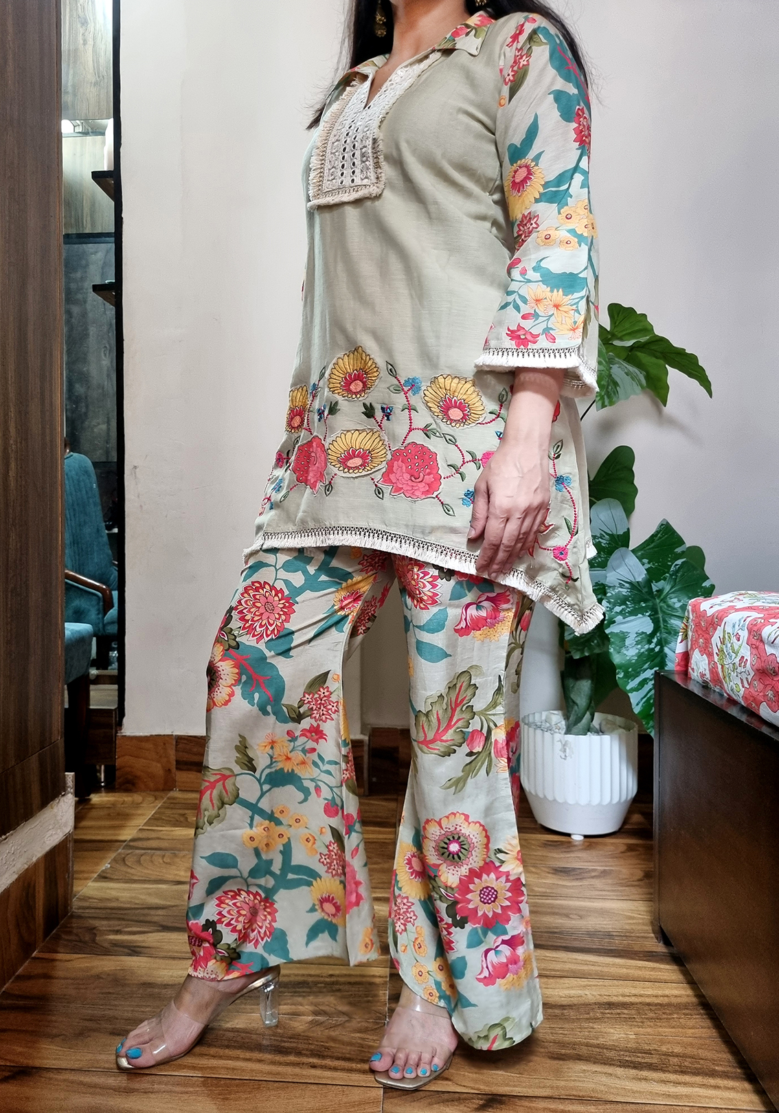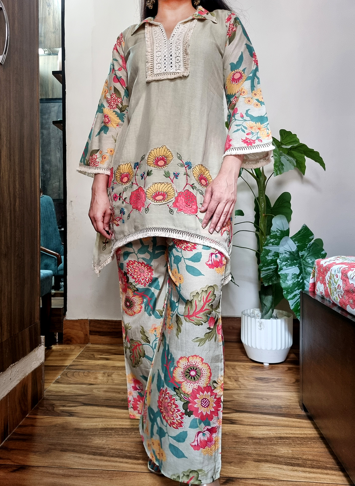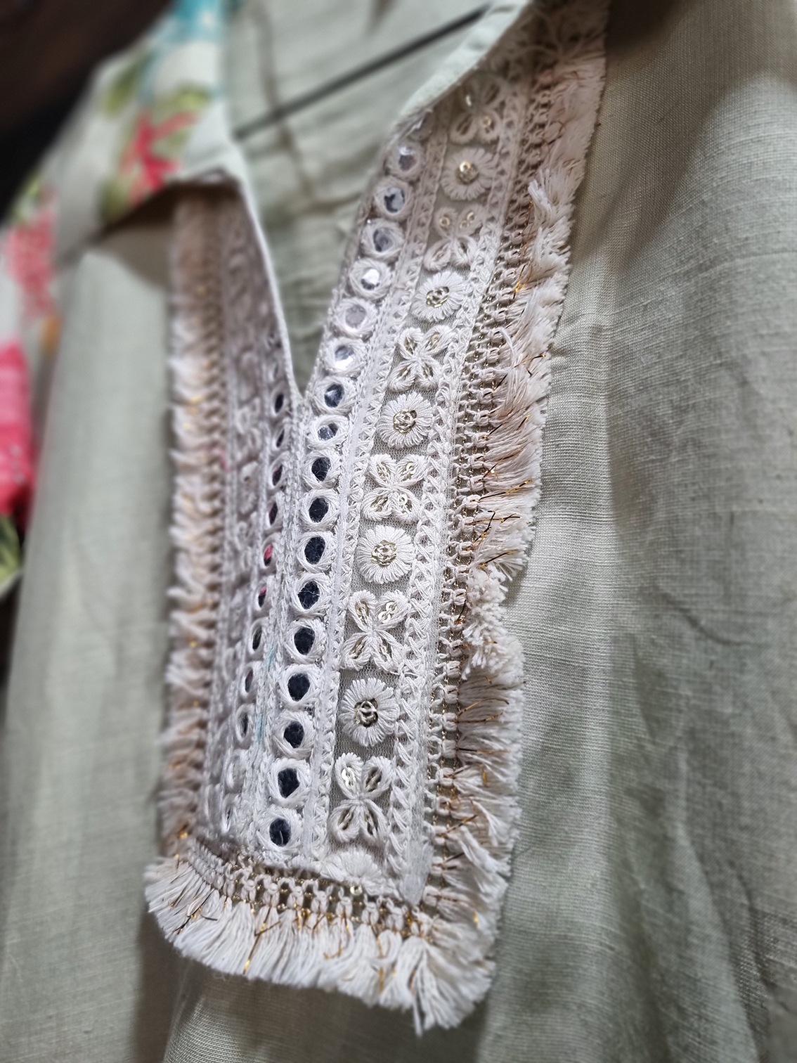 Top Fabric: Muslin fabric, featuring printed designs, patchwork, embroidery, and lace work, with lining, fully stitched.
