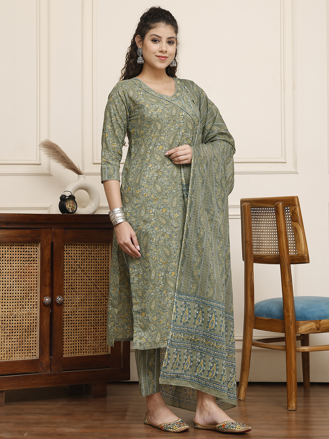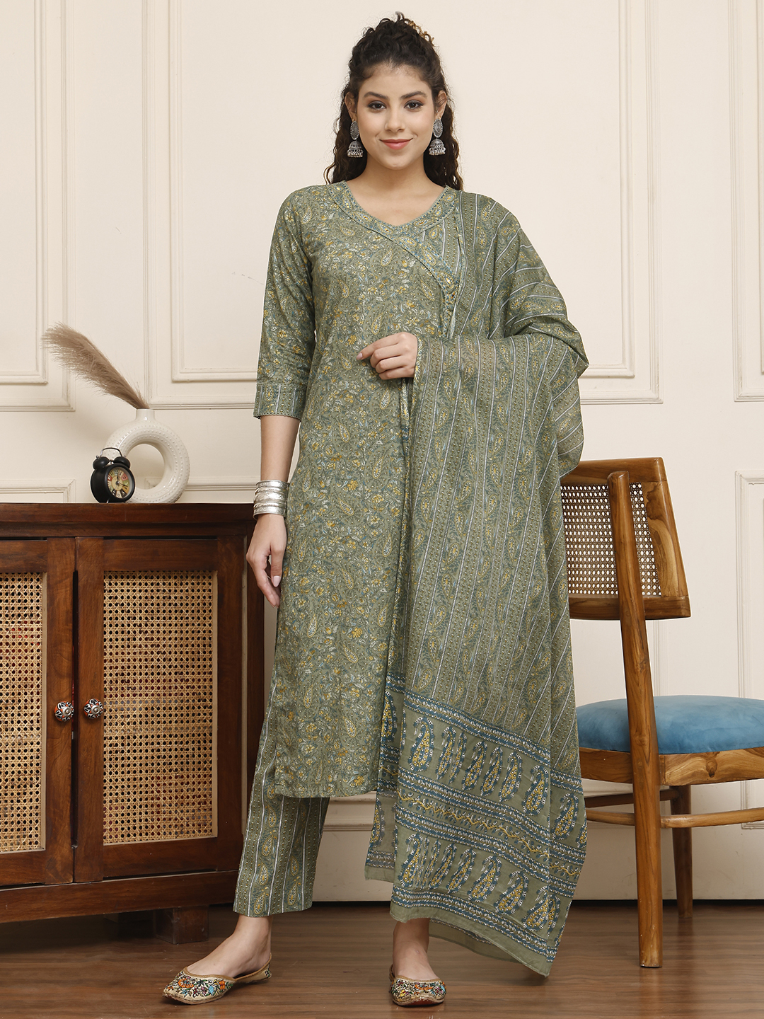 | Name : | Olive Green Printed 3 Piece Suit Set |