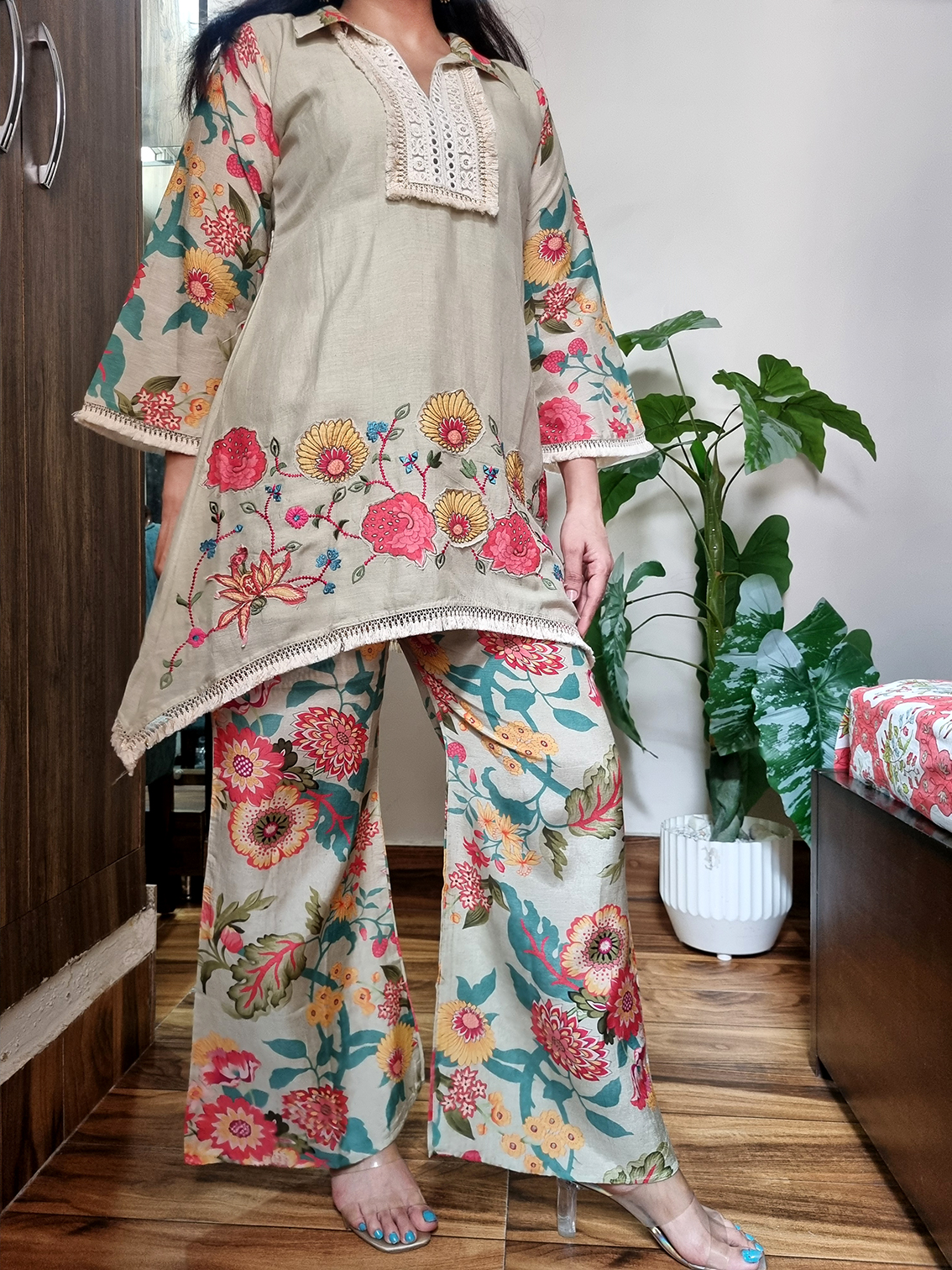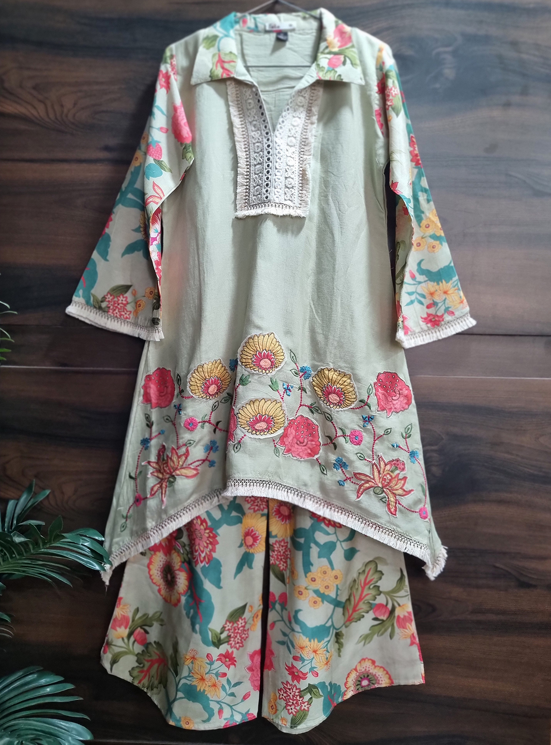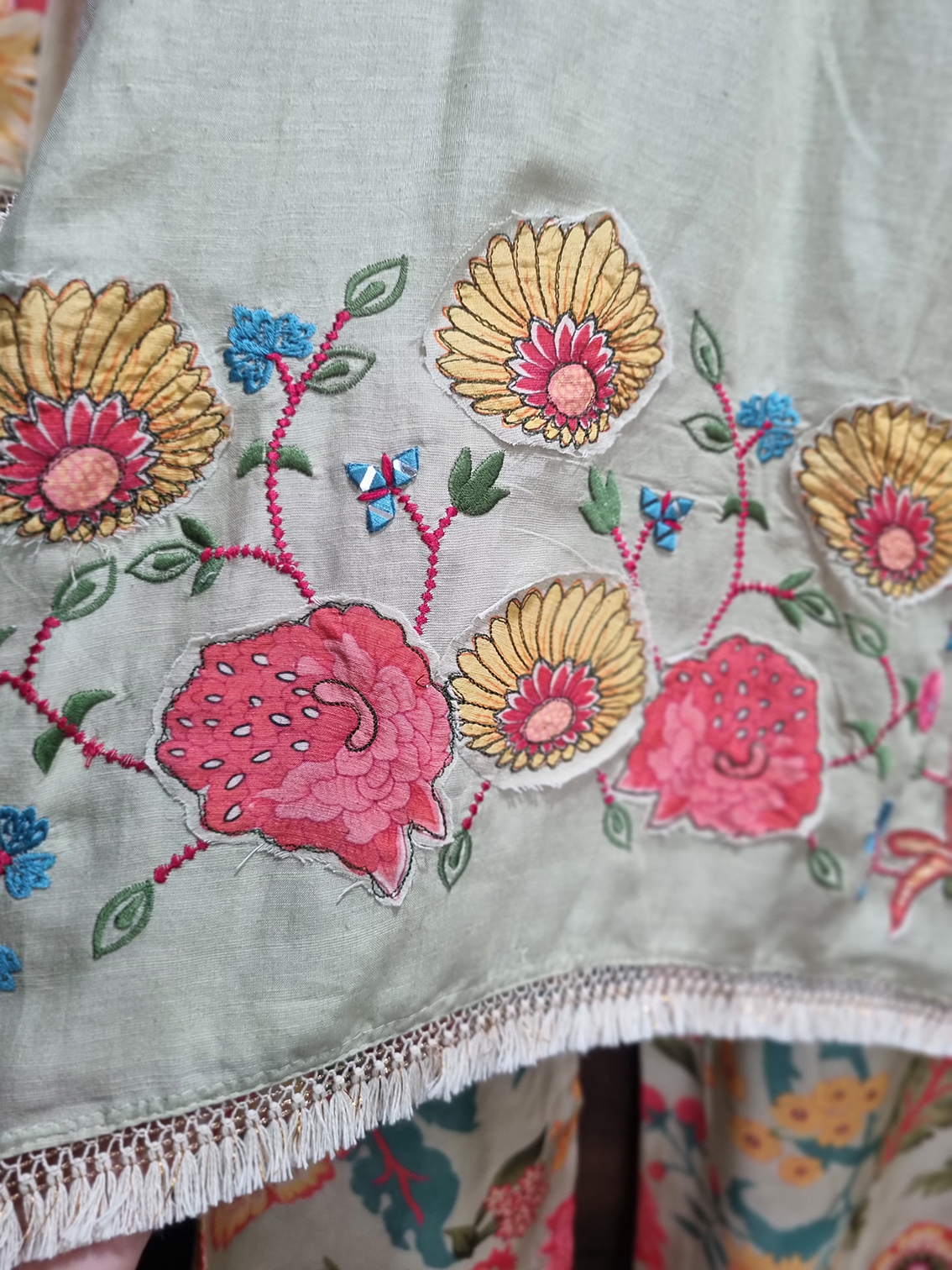 Top Fabric: Muslin fabric, featuring printed designs, patchwork, embroidery, and lace work, with lining, fully stitched.