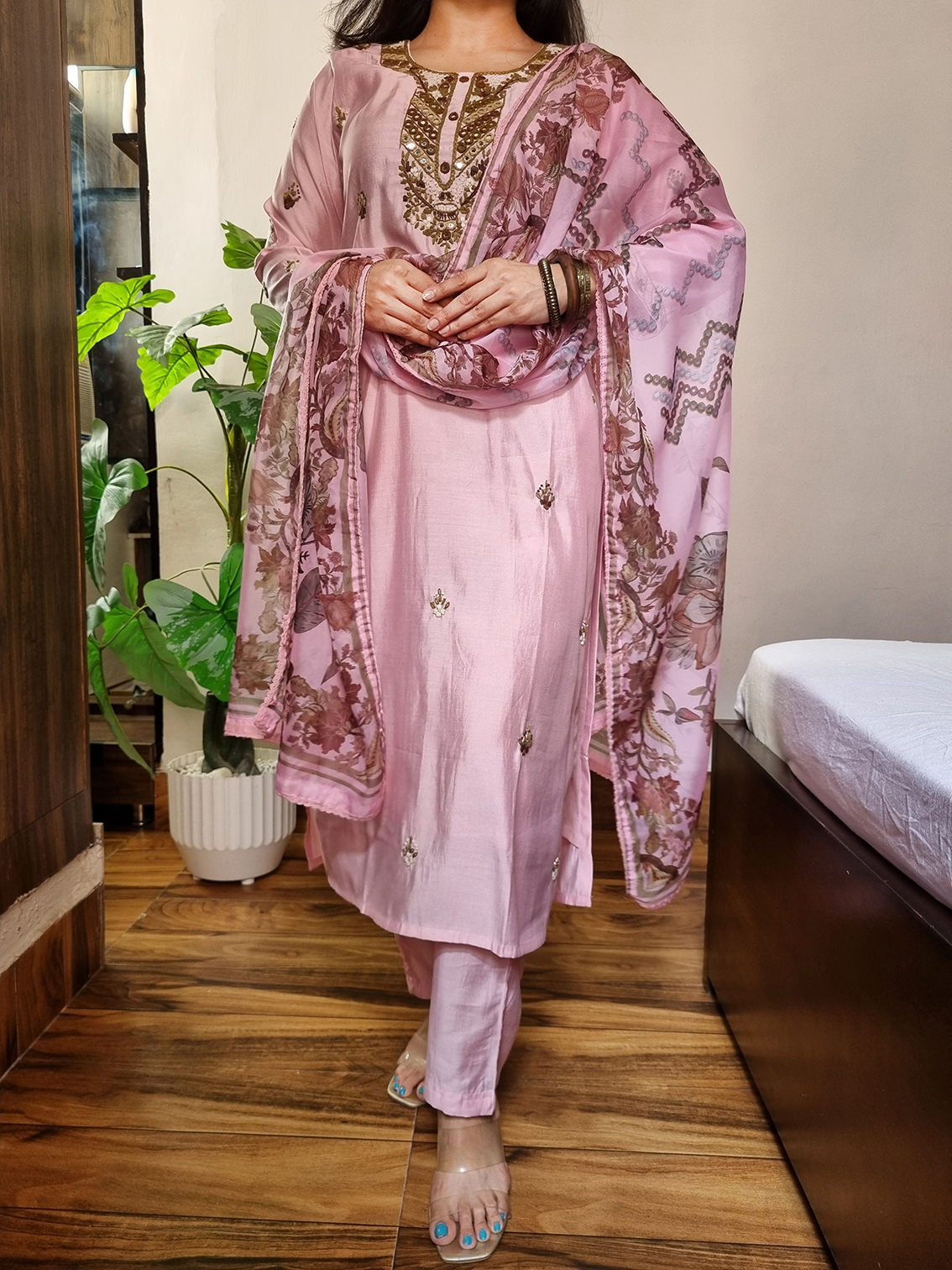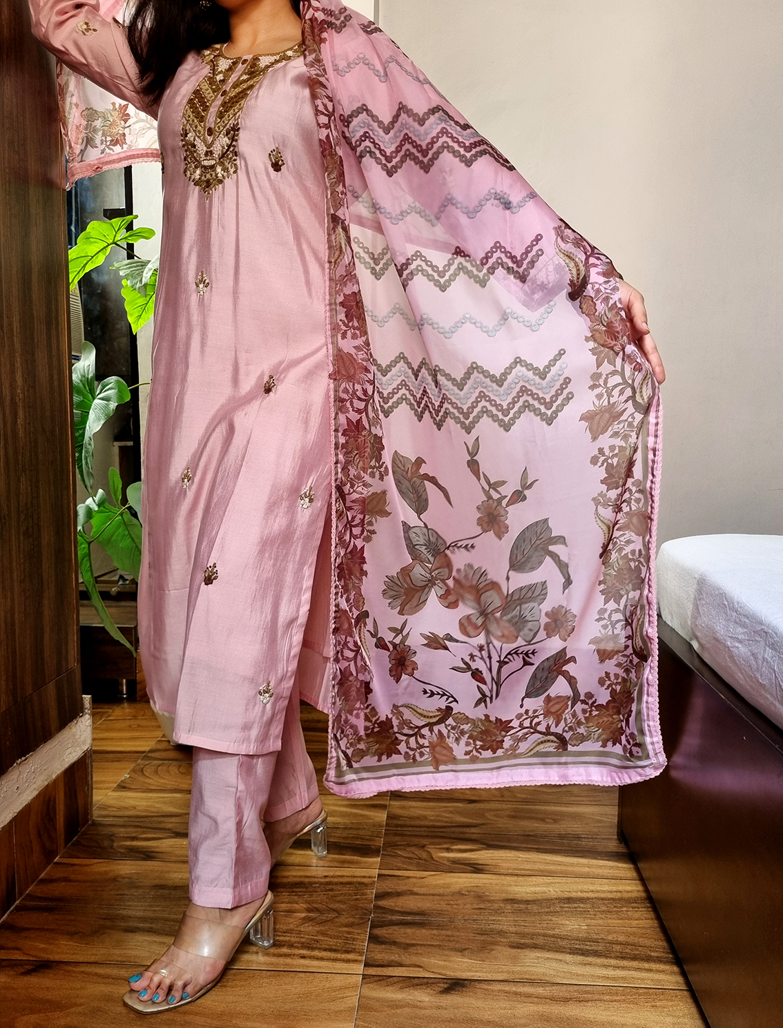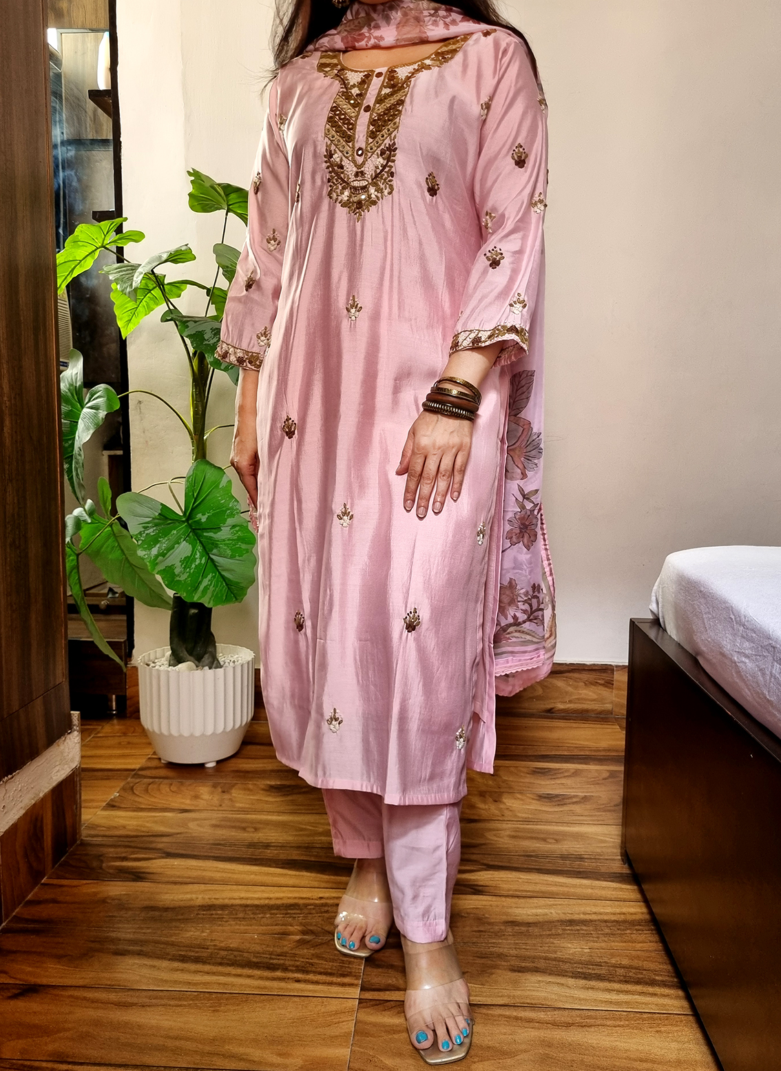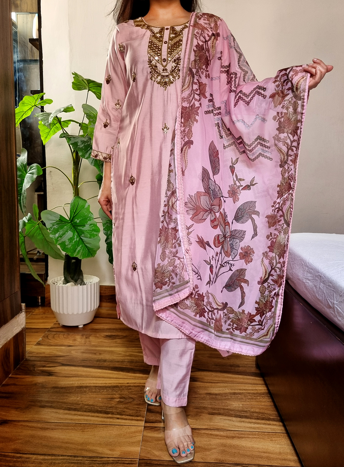 | Name : | 017 Pink roman silk hand embroidered suit set |