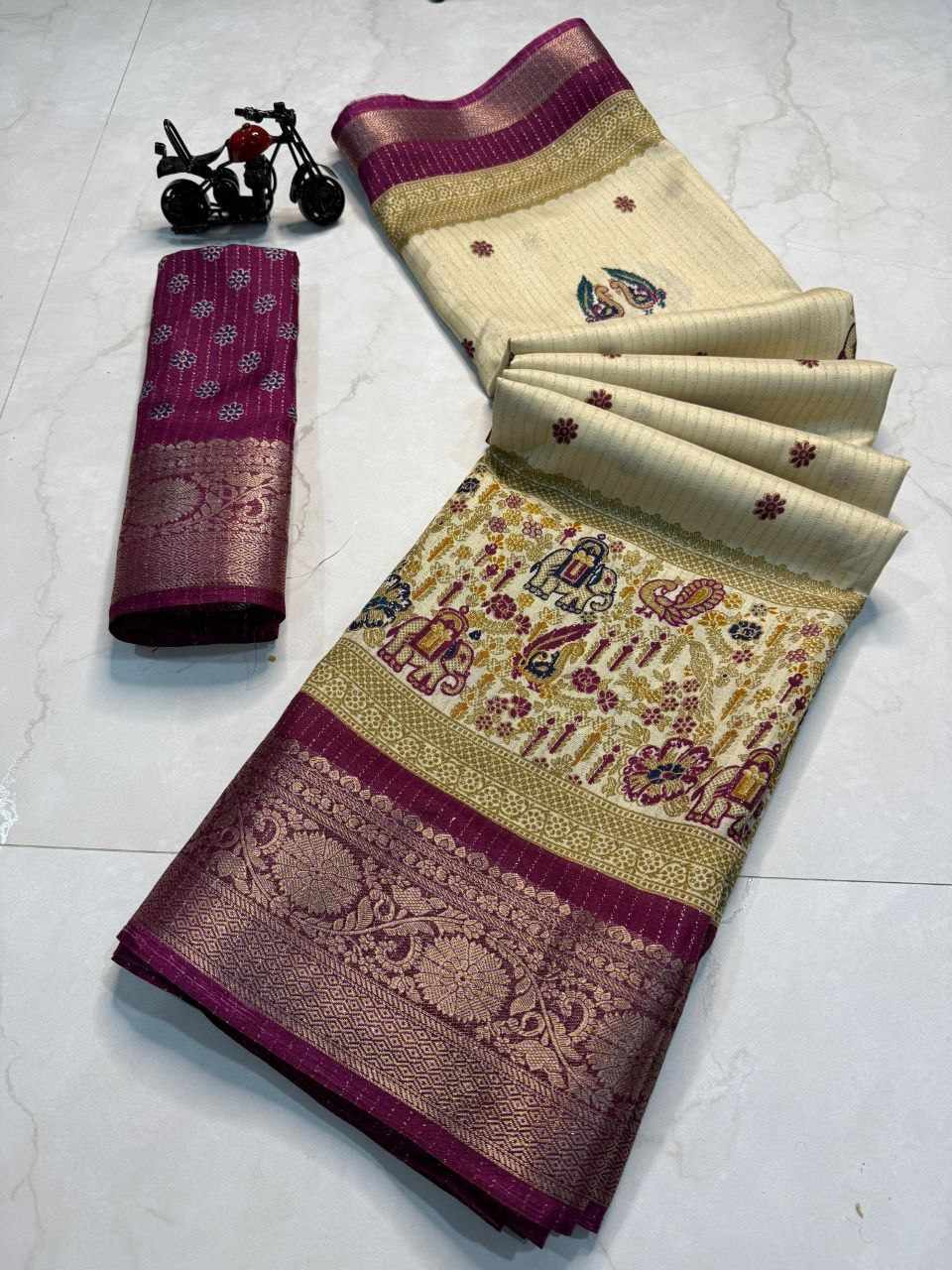 Crafted in luxurious Dola Zari fabric, this saree features classic zari weaving with a graceful lining design that adds a royal and traditional charm. Perfect for festive wear, weddings, and special family occasions.