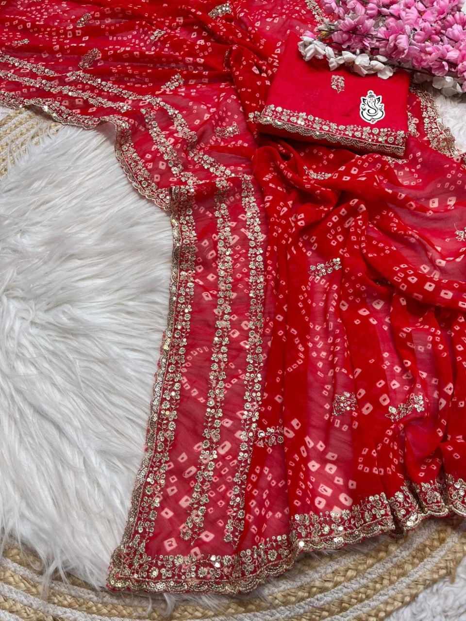 PIYU P1033 LEHERIYA BANDHANI RED SAREE