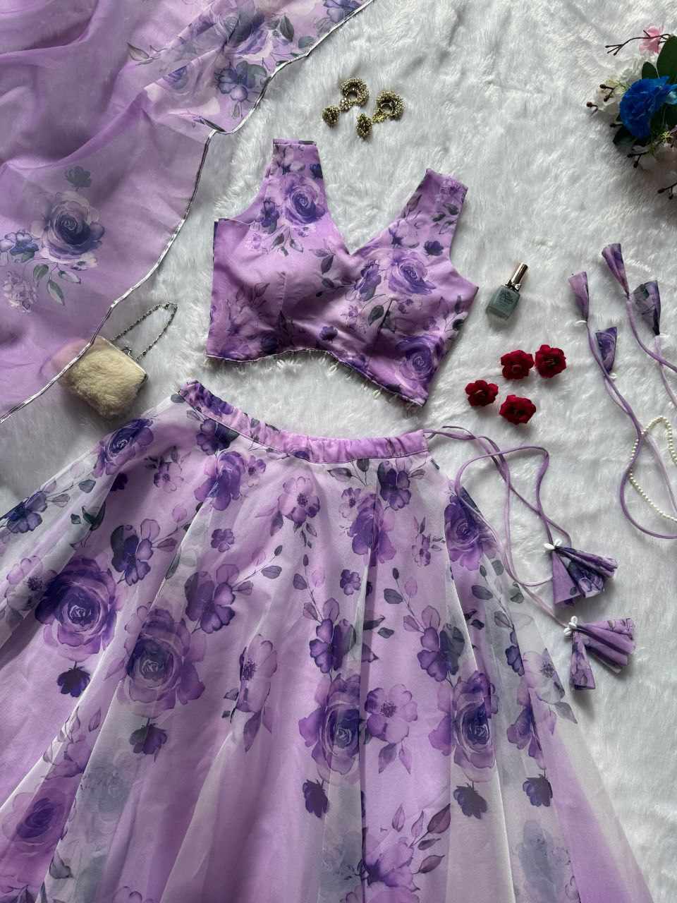Lehenga – Pure organza silk digital printed lehenga with a grand 8-meter flair. Finished with canvas patta for a perfect flare